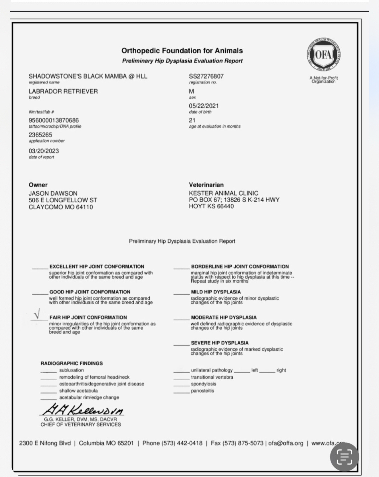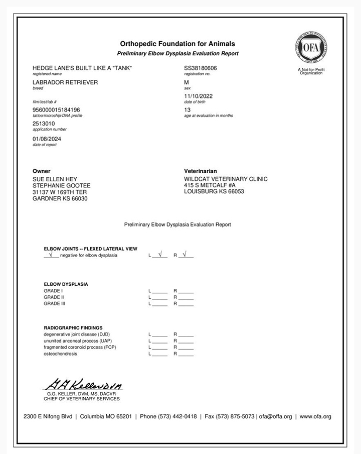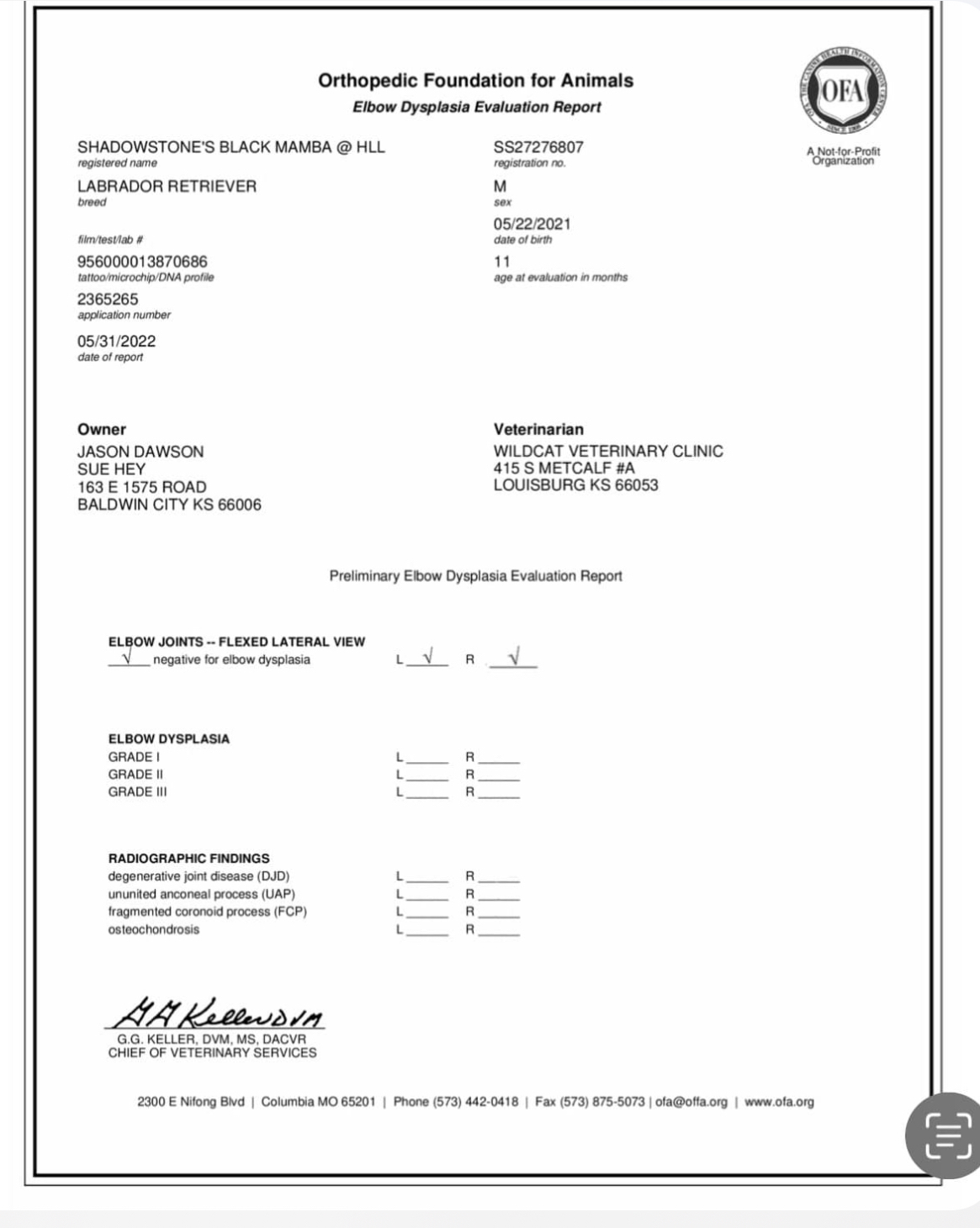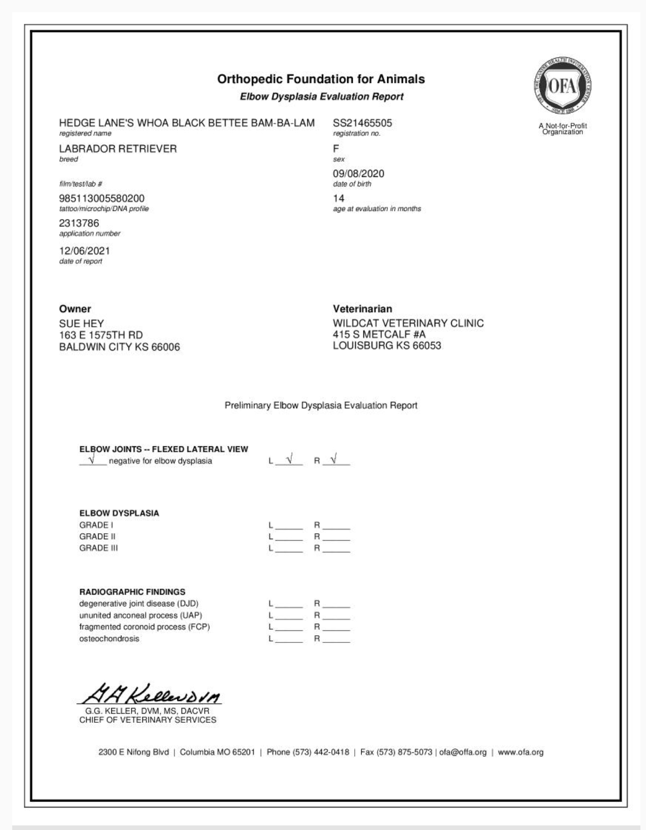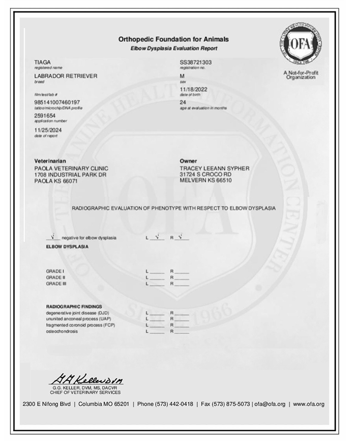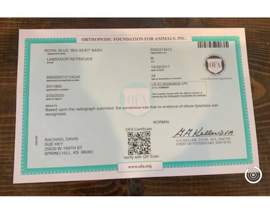 Sales Receipt/Health Guarantee that covers hip dysplasia, (any pup diagnosed with moderate or severe hip dysplasia before the age of 2) elbows, eyes, and all 177 genetic diseases we test for through Embark along with 2 new diseases we test for through paw prints.
