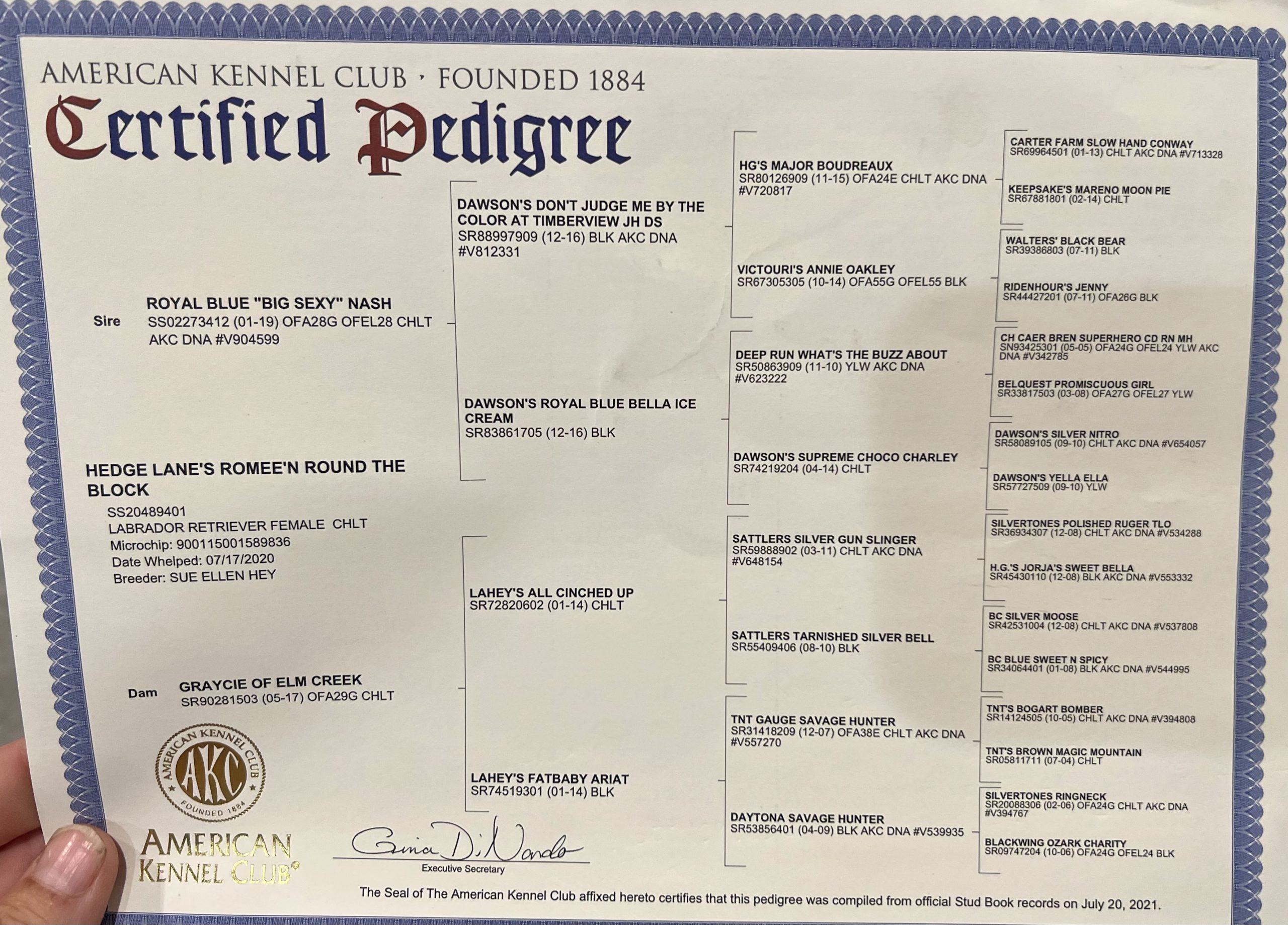 Nash is also a proven Stud who’s sired many natural breeding litters and several artificially inseminated litters. He’s a super chill boy. Not bothered by much and loved by everyone he meets. He loves chasing balls and women, but never in a hurry to get anywhere else! Nash is super affectionate but won’t ever pass up wrestling around with his best friend in the whole world, Brodee, our 9-year-old son. Our family doesn’t hunt, but I know he would be great at carrying ducks as he loves to carry his pillow everywhere he goes!