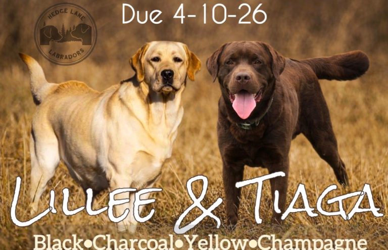 Tiaga was born here from our Mayna & Elway litter. His pedigree is packed with champion show titles. He’s got the best temperament you can find on a dog. He’s been producing some beautiful puppies! Hedge Lane Labradors does not own him, but I get discounts on stud services. He is available for live breedings & semen shipments.